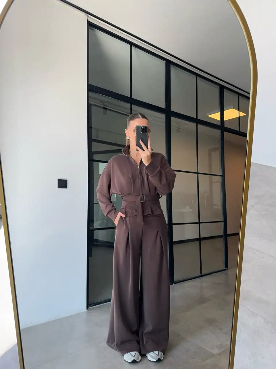 طقم رمادي واسع الساقين بتفاصيل حزام