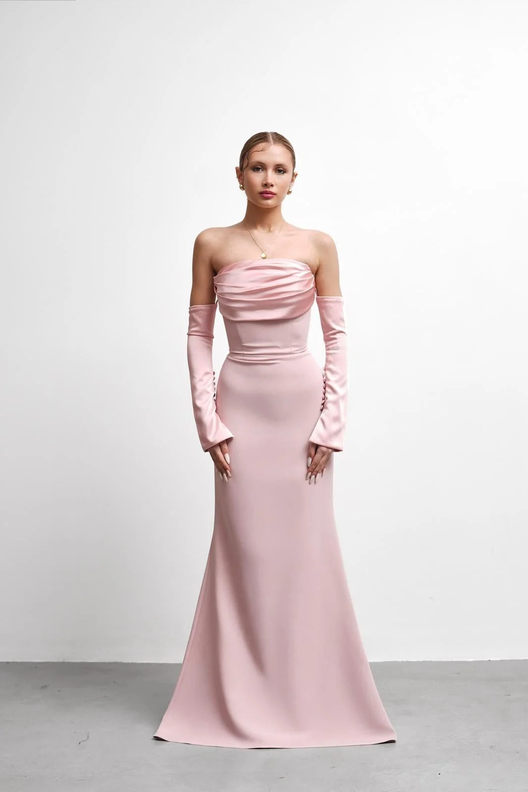 فستان سهرة بأكمام من الساتان الأزرق الفاتح من علياء
