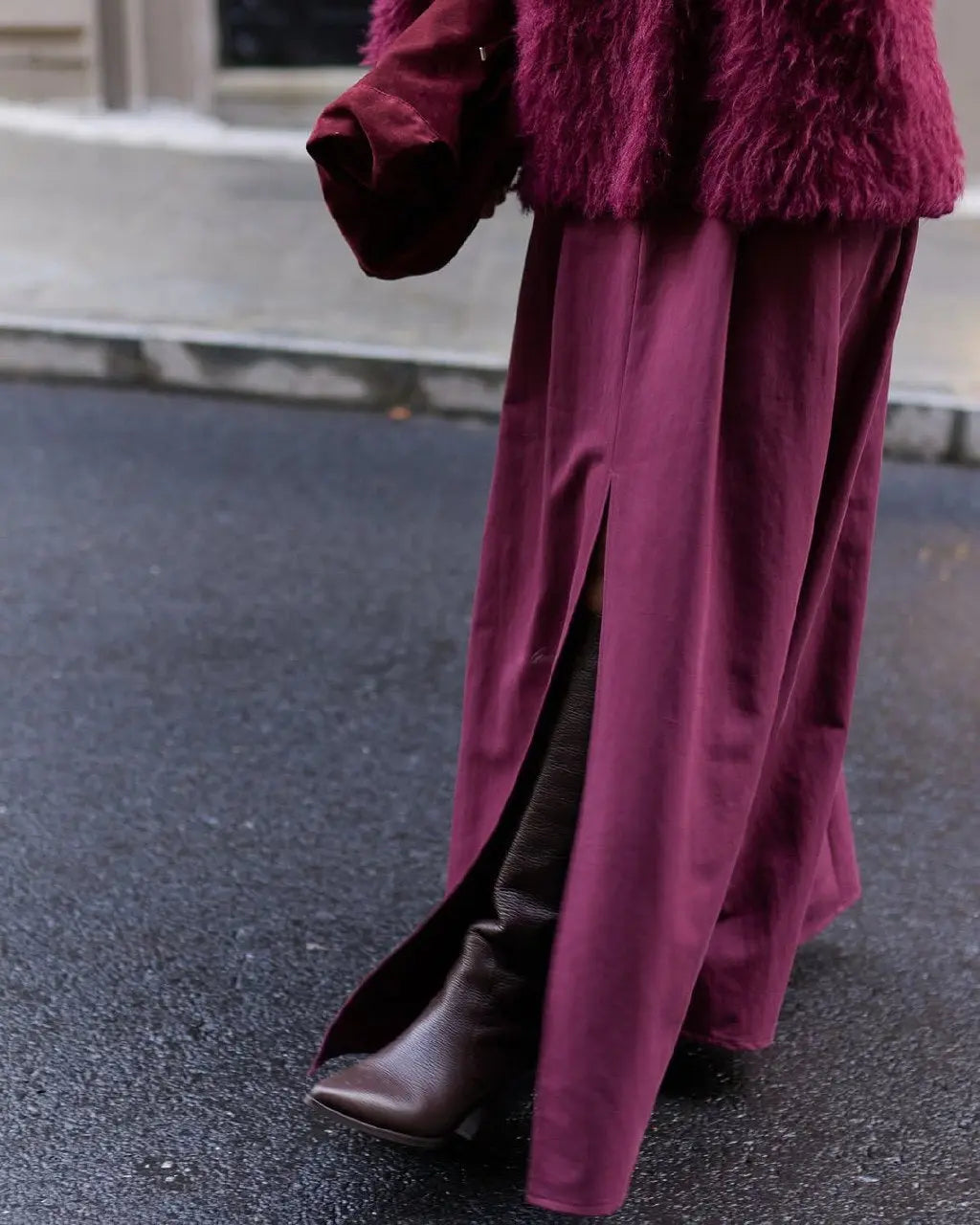 Brown Pleated Long Skirt with Front Slit Detail and Two Side Pockets ARVERNA