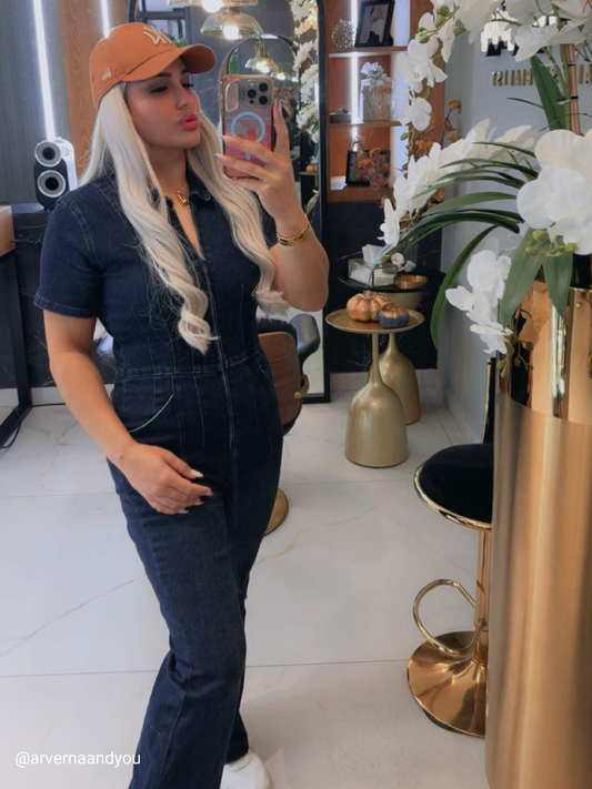 Denim Overalls with Front Zipper Short Sleeves and Bell Bottoms Suit