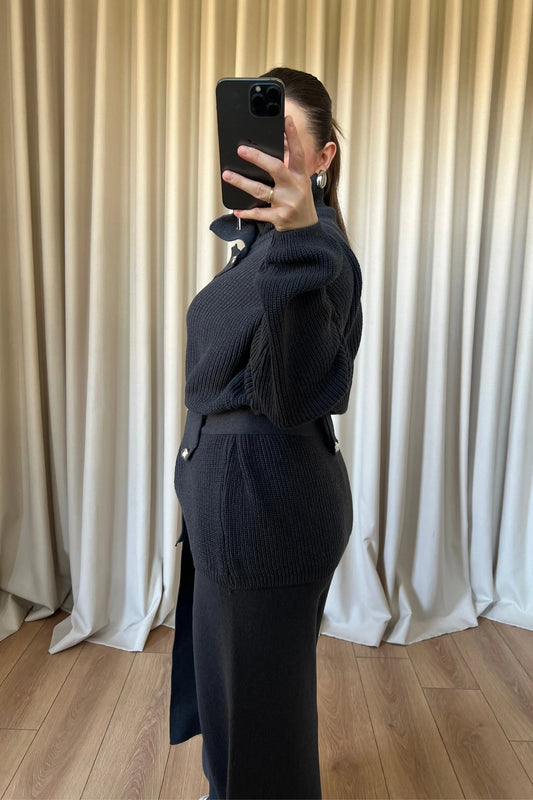 STAND-UP COLLAR BELTED KNITWEAR SET