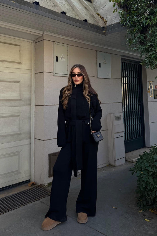 STAND-UP COLLAR BELTED KNITWEAR SET