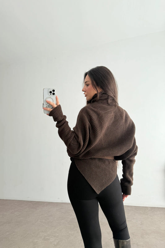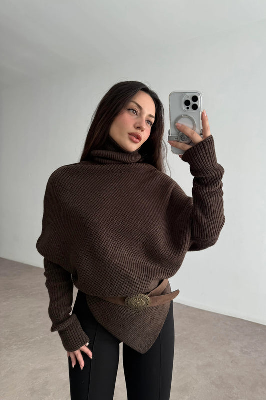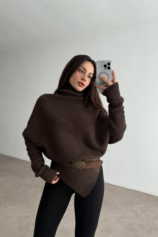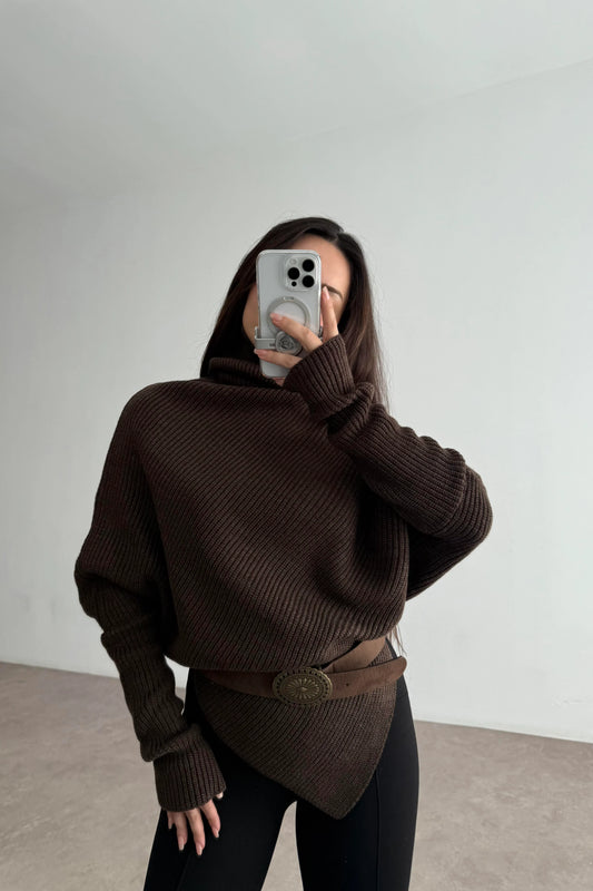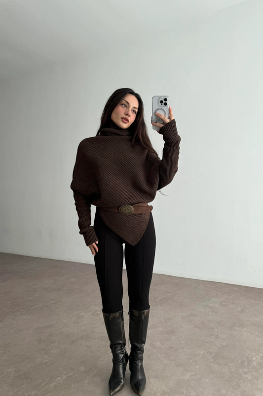 Dark Brown Turtleneck with V-Cut Hem Sweater