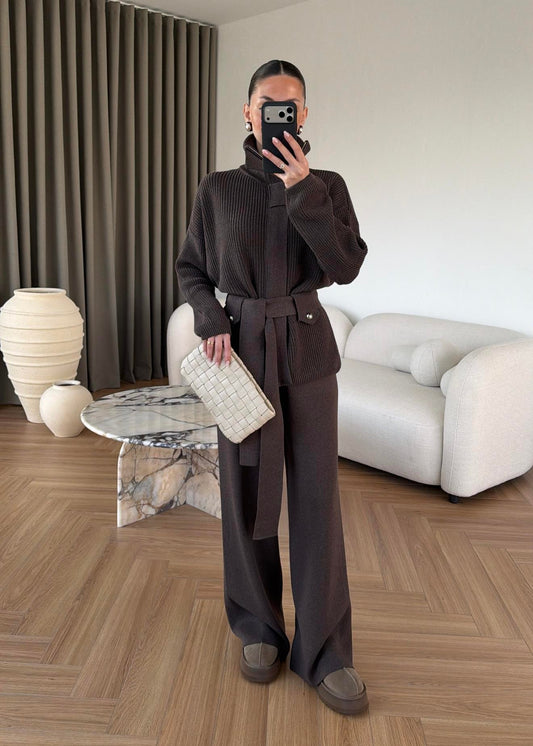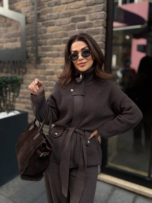 STAND-UP COLLAR BELTED KNITWEAR SET